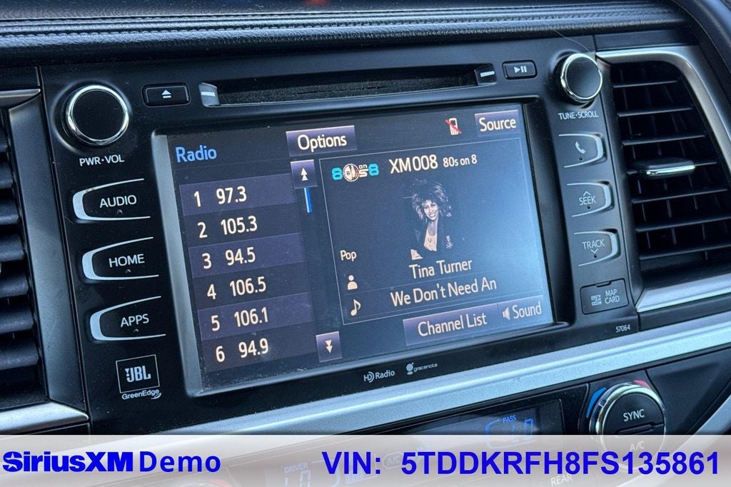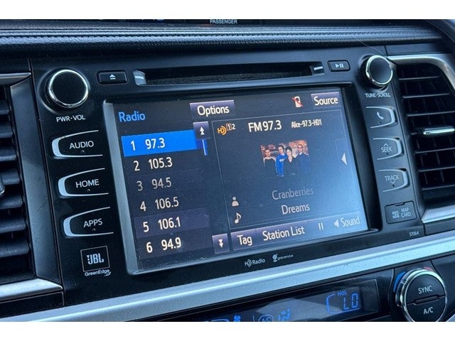 - Radio: Entune Premium JBL Audio w/Nav & App Suite -inc: the Entune Multimedia Bundle (8-inch high resolution touch-screen w/split screen display, AM/FM CD player, MP3/WMA playback capability, 12 JBL GreenEdge speakers, auxiliary audio jack, USB 2.0 port w/iPod connectivity and control, advanced voice recognition, hands-free phone capability, phone book access and music streaming via Bluetooth® wireless technology), Entune App Suite, Intelligent Touch controls, SiriusXM Radio w/3-month complimentary trial, HD radio, HD predictive traffic and doppler weather overlay, AM/FM cache radio, and Gracenotes album cover art